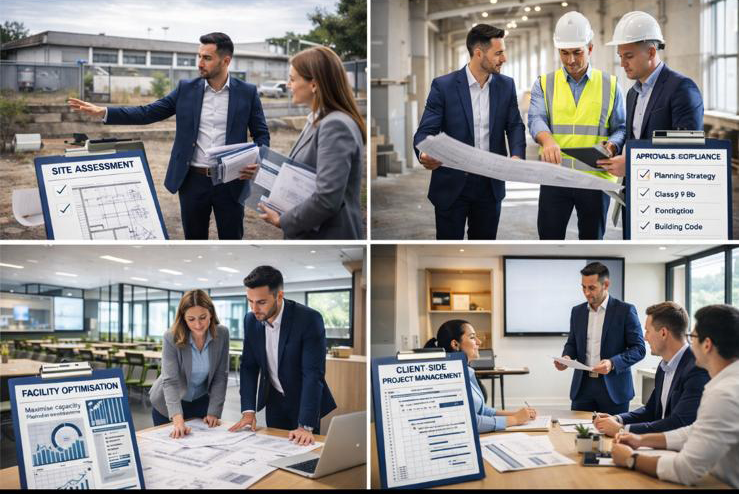 This includes repositioning commercial and industrial property for Class 9B education use, early feasibility advice, review of planning and compliance constraints, and guidance on occupancy, functionality and overall site potential.